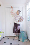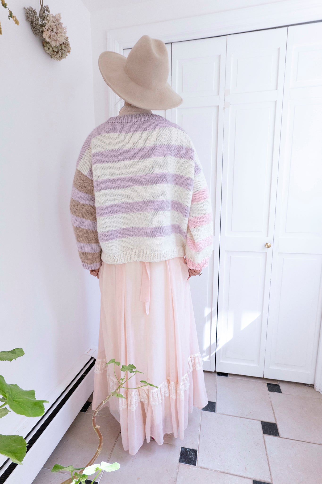 The body of this sweater is worked bottom up flat in two pieces. Stitches for the sleeves are picked up from the body and worked in the round. Sleeves are worked from shoulder to cuff. Pattern is written for striped version, to make a solid version in one color follow same pattern but ignore any color changes - knit everything in one color.