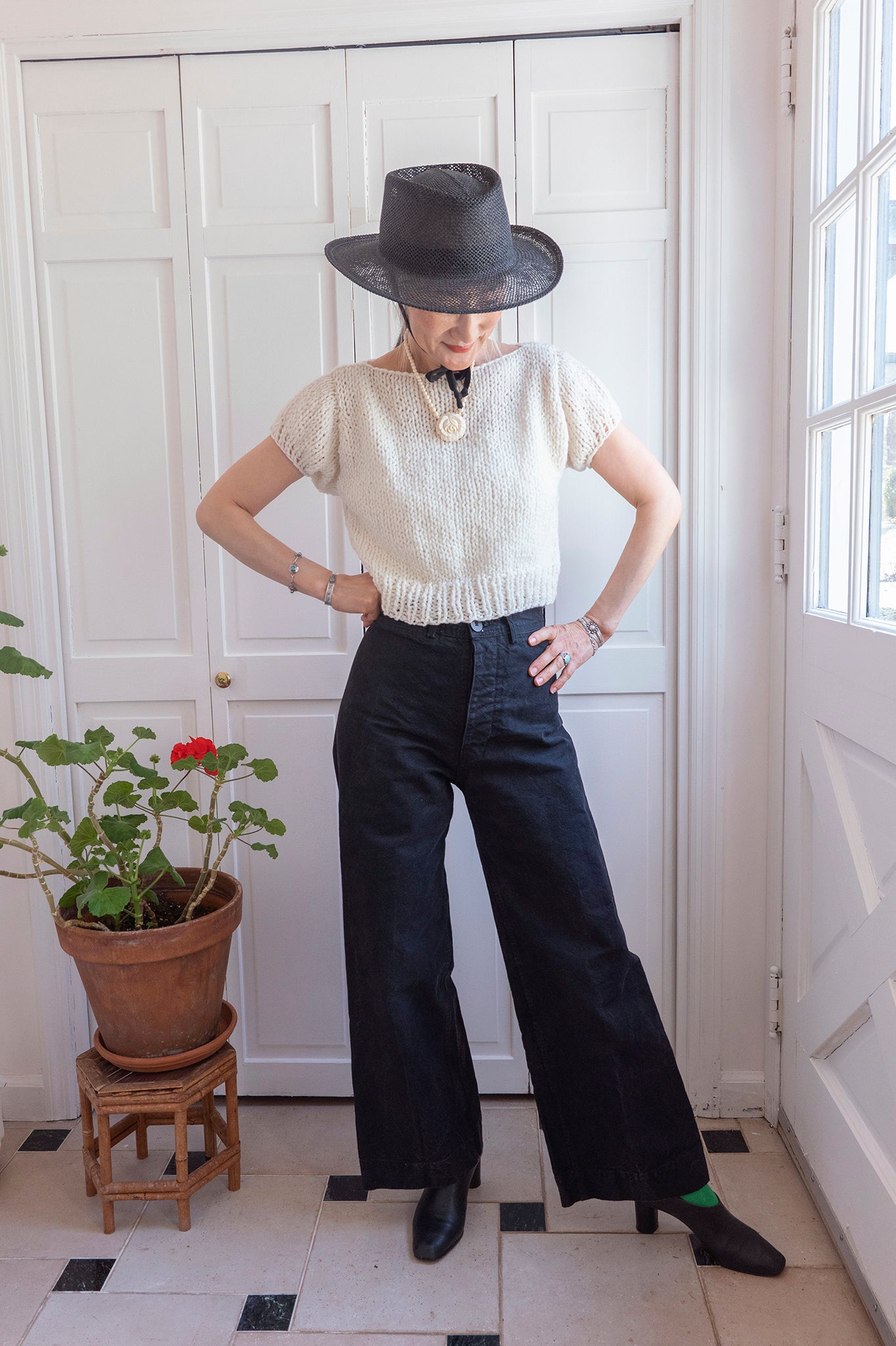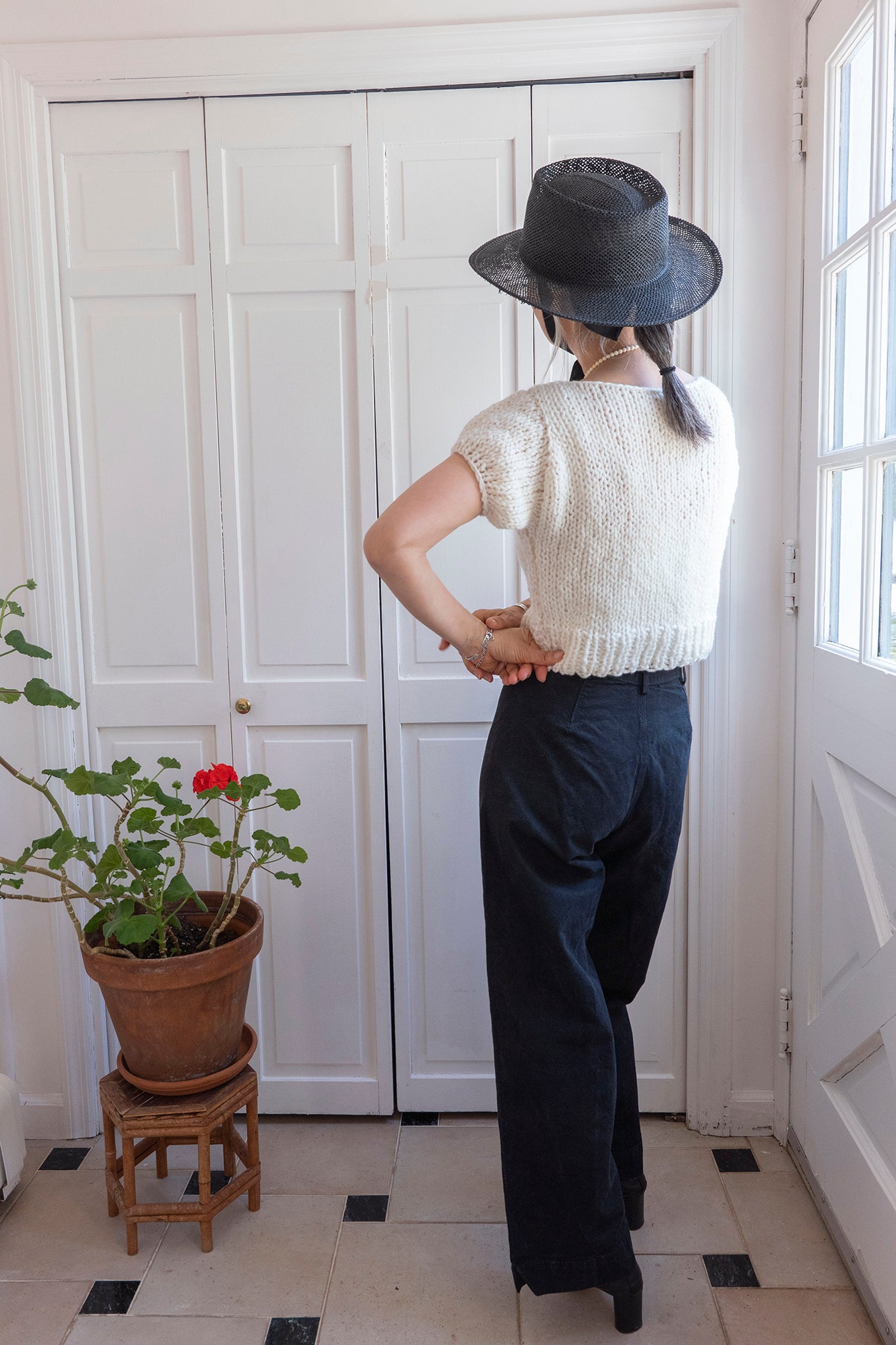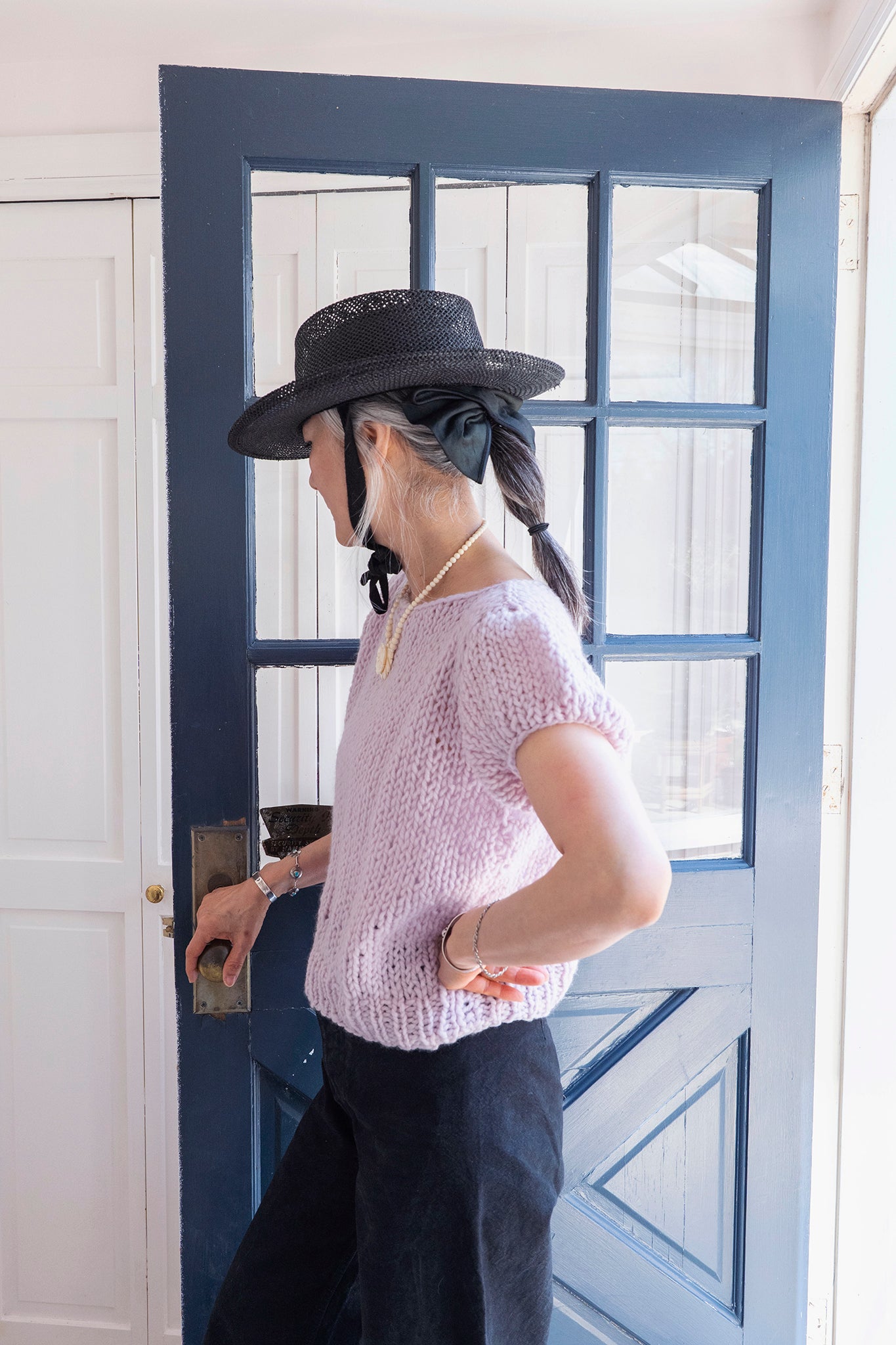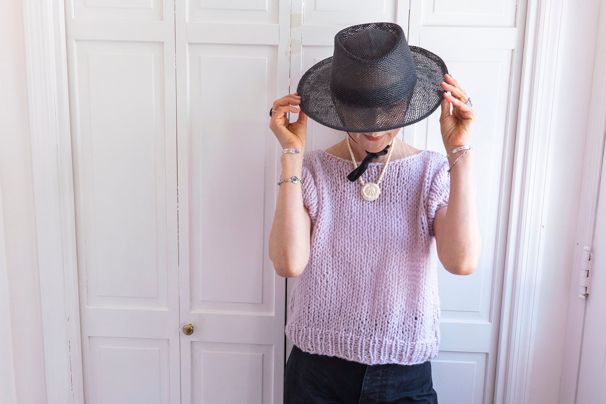 This top is knit bottom-up and in pieces. You will separately knit identical front and back pieces before seaming them together at the shoulders. Next, you will pick up stitches for the armholes and knit the sleeves. You will finish by seaming the sides beneath the arms.